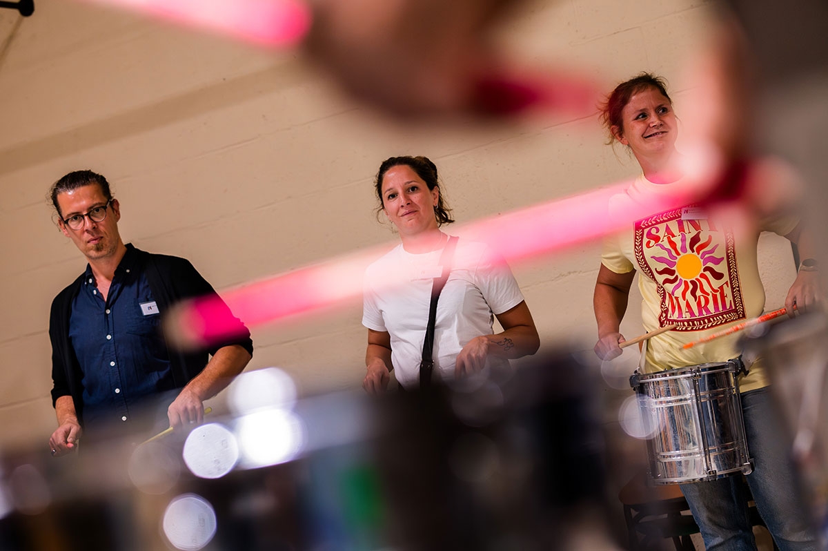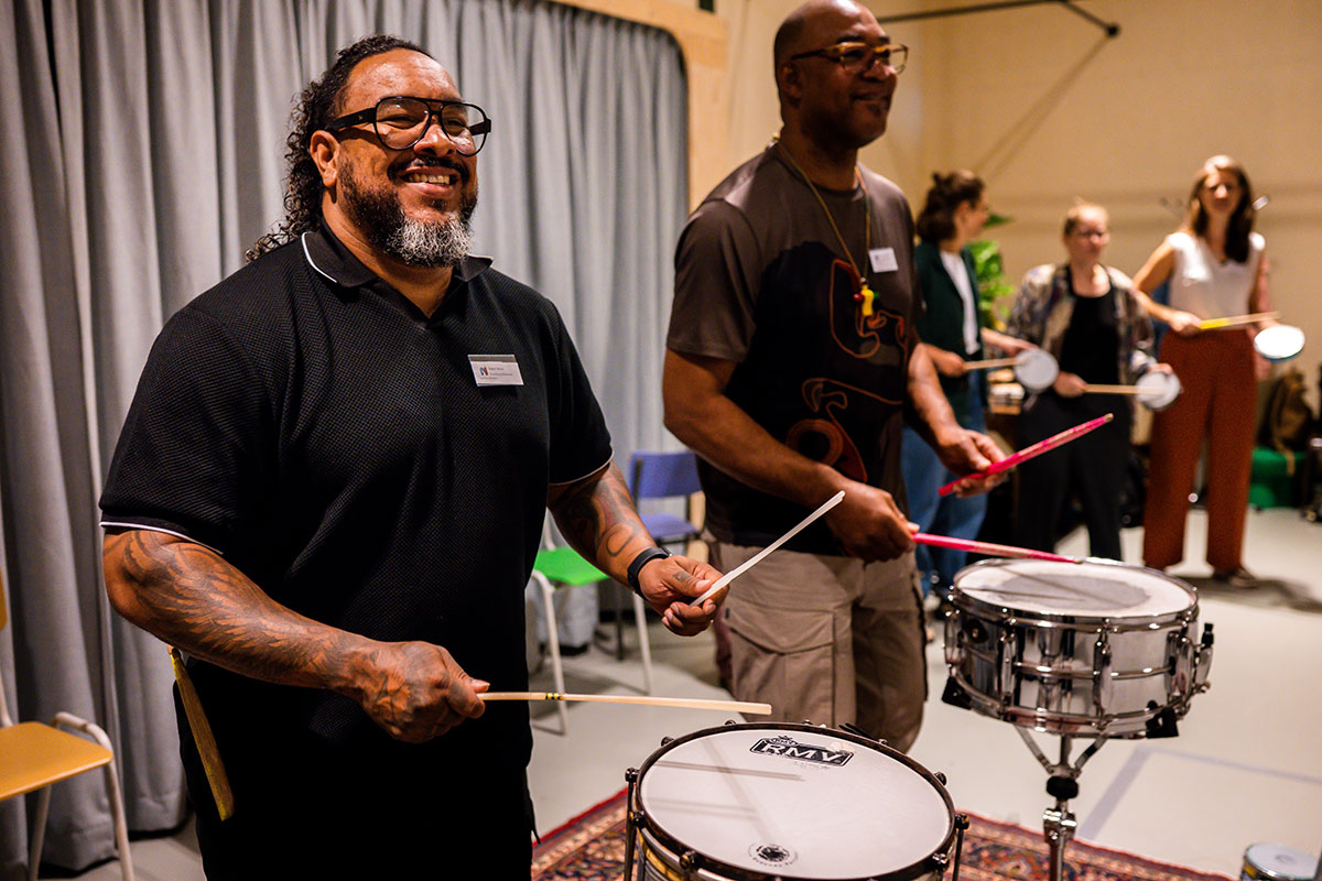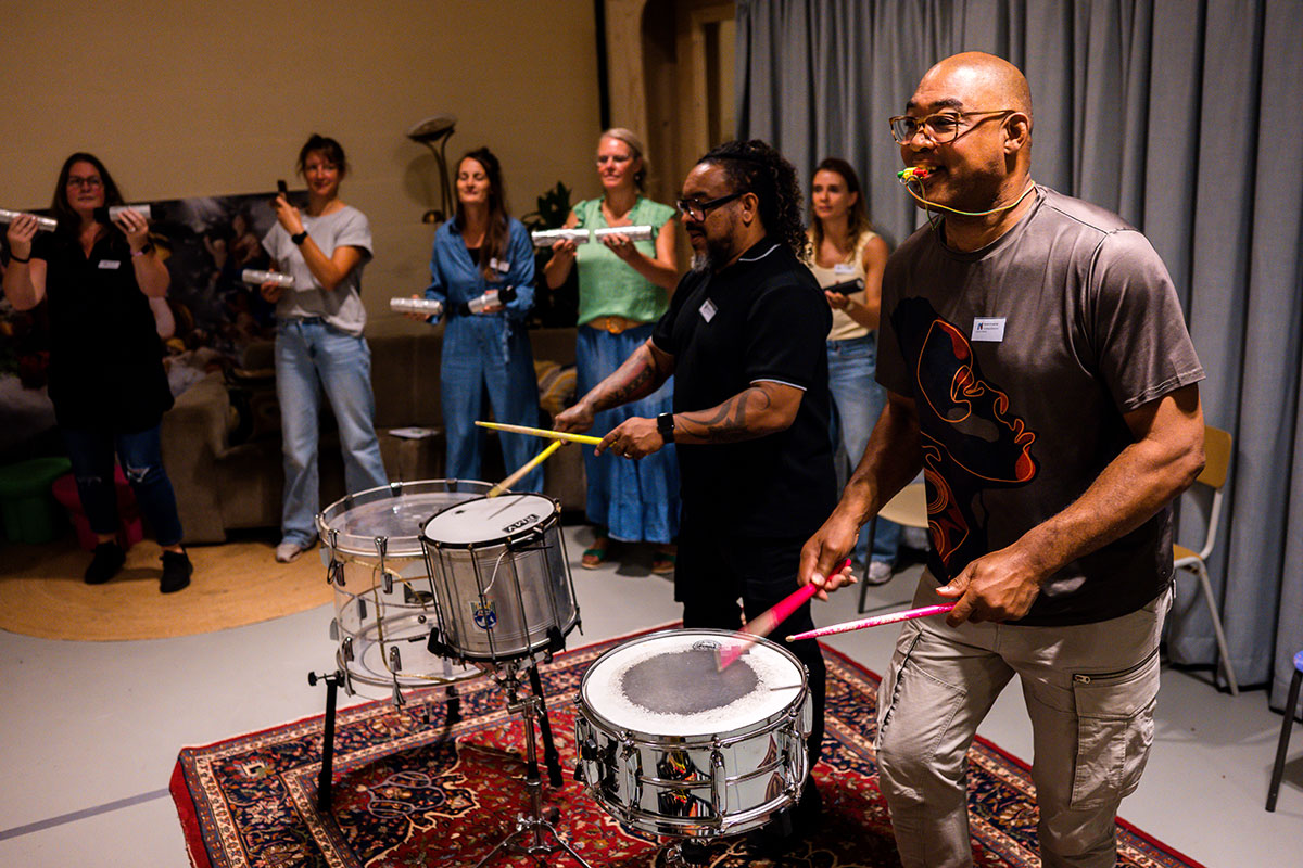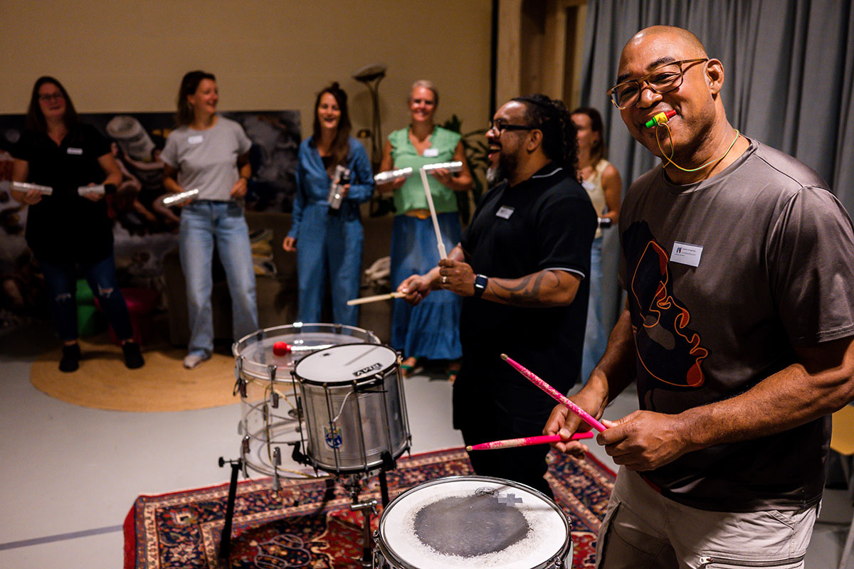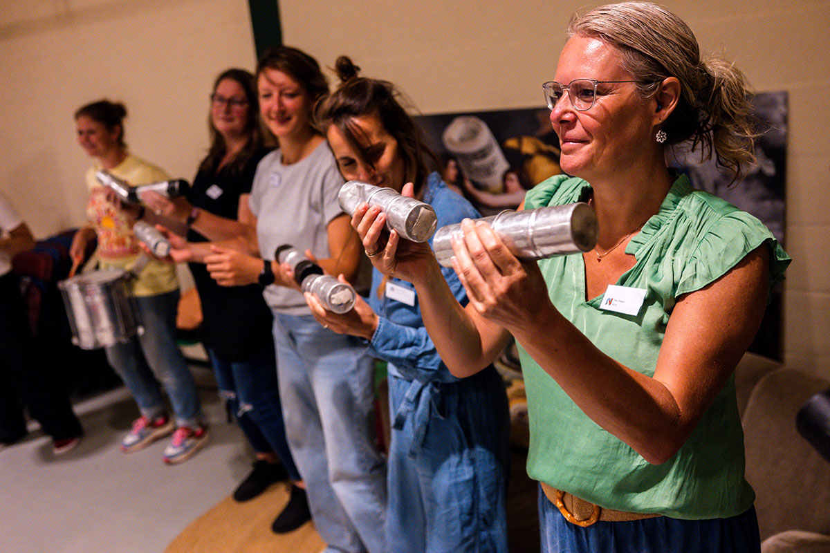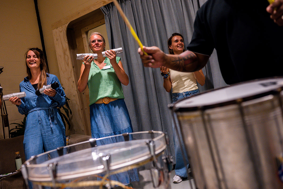 Bij binnenkomst stonden diverse Braziliaanse slaginstrumenten te wachten in de ruimte: van Braziliaanse bel met hoge noten tot de Surdo, een grote trommel die het ritme bepaald. Genoeg instrumenten om iedereen in de groep mee te laten doen. De grootste les van Sherwin? Durf fouten te maken, en doe dat met overgave. Alleen zo kun je leren.
