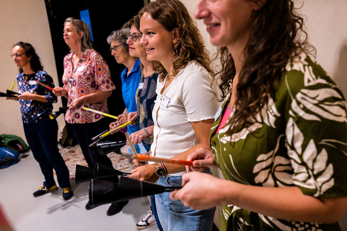 Na de pauze wisselen de leerlingen van instrument en jij, als docent, vertelt niets. Ze moeten aan elkaar de techniek en het ritme uitleggen. Wanneer iedereen tevreden is start je direct. En gaat het fout, dan is dat alleen maar goed.