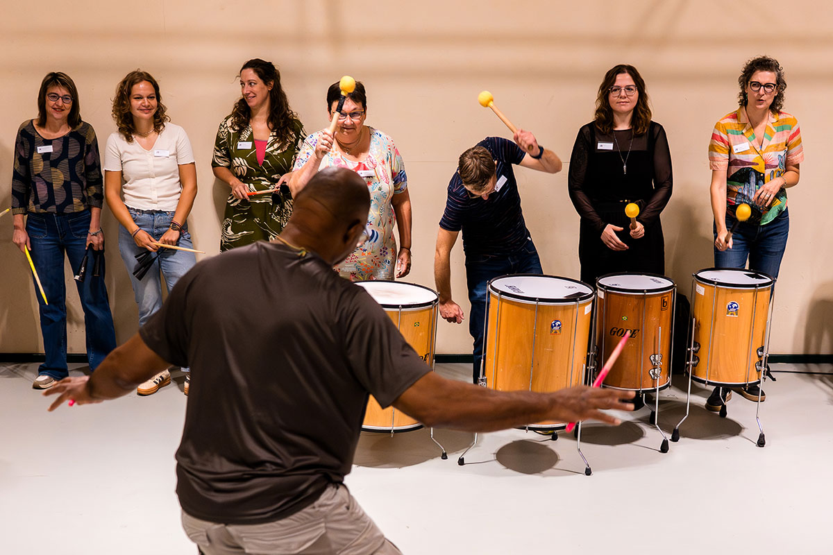 Start rustig maar maak de leerling enthousiast om mee te doen. In deze workshop begint Sherwin met een opzwepend ritme om te laten horen wat het eindresultaat zal zijn. Dat werkt motiverend! Daarna worden er subgroepjes gemaakt die elk een deel van het ritme gaan spelen. We starten met 4 personen die de Surdo bespelen. Met deze grote trommel speelt het groepje een basisritme van 8 tellen. Zodra dit onder de knie is, komen de kleinere trommels erbij, stap voor stap breiden we uit. Elke keer dat er een nieuwe groep start gaat de hele groep mee in het ritme. Zo wordt de muziek steeds voller en stijgt de passie. Je bouwt dus rustig op, maar boekt snel resultaat waardoor het enthousiasme van alle leerlingen toeneemt.